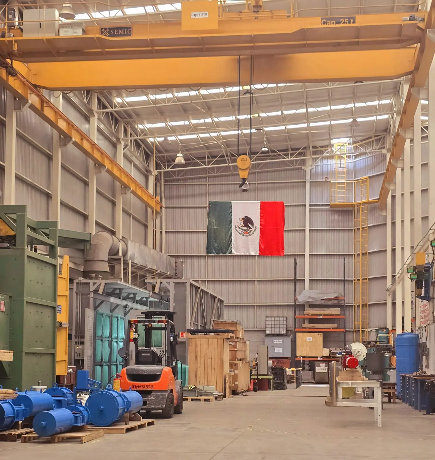 Grúa viajera de una capacidad de 25 Ton y un claro de 13 metros, además de 10 grúas bandera de 1 Ton y 2 Ton.